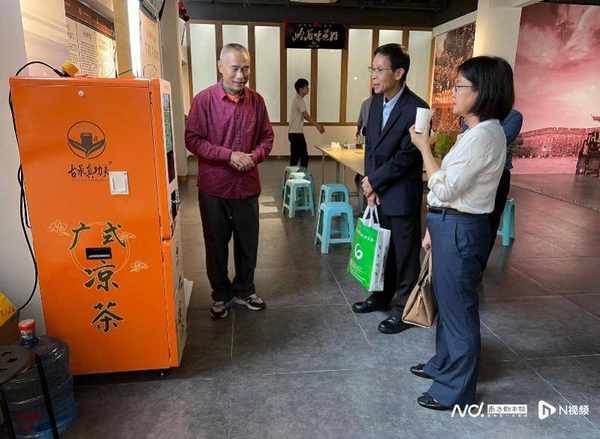 展會現場,遊客在瞭解涼茶智能無人售貨機,體驗5秒自助制作一杯涼菜