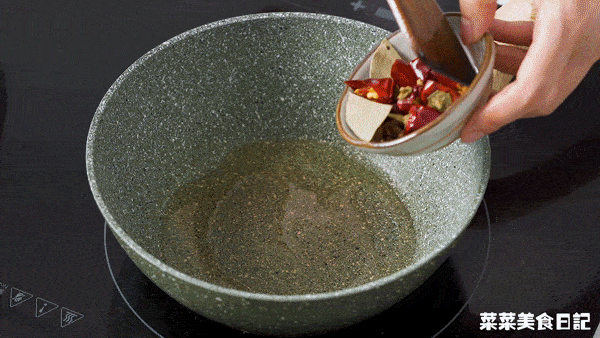 3. 鍋加入少許底油,煸香1個八角、1片香葉、1小勺小茴香、2-5個幹辣椒段,再加1小勺甜麵醬炒散,放入煎好的豆腐翻炒均勻。