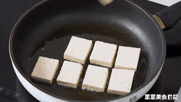2.平底鍋裏倒入1-2大勺食用油沒過鍋底,燒至五六成熱(約160℃),放入切片豆腐中火煎至兩面焦香,再將它豎在邊緣煎,讓四周都形成硬殼·如果喜歡軟糯多汁口感,煎至豆腐表面有薄薄一層硬殼即可·家裡有烤箱的小夥伴,可以在切片的老豆腐上抹一層油,送進烤箱200℃烤15-20分鐘,期間記得觀察上色情况。