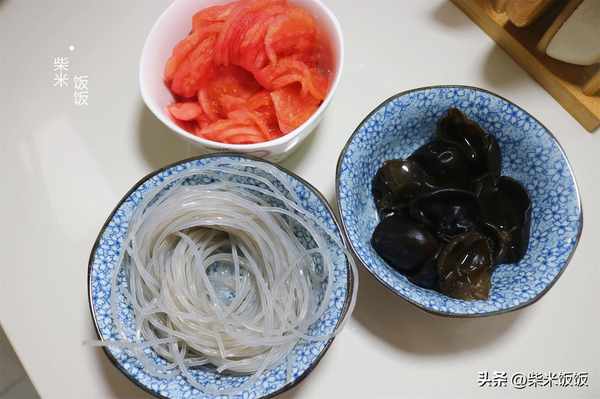 1,西紅柿去皮,切成薄片。木耳和紅薯粉條分別用溫水泡軟。