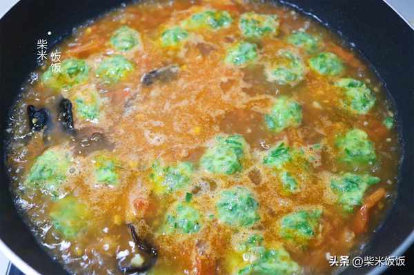 7,鍋裡的湯煮開,把韭菜丸子一個個放進來。煮至定型,用鏟子沿著鍋邊輕輕推動,這樣丸子就不會散開。