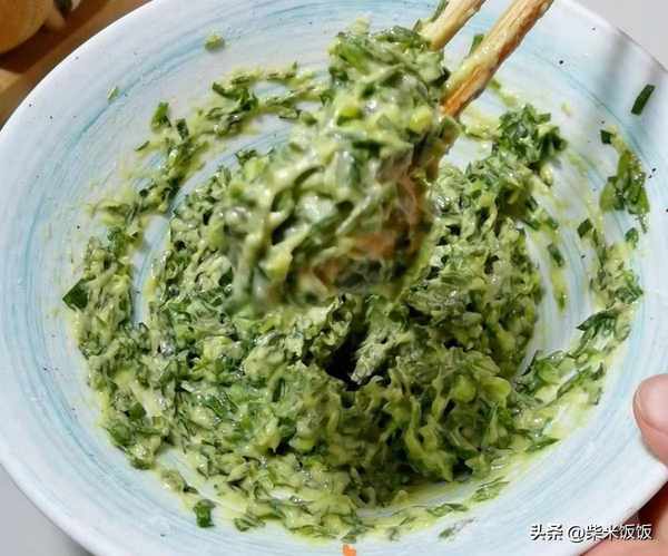 2,韭菜切碎,加鹽、一個雞蛋、2勺面粉、少許清水攪拌成比較粘稠的面糊狀。
