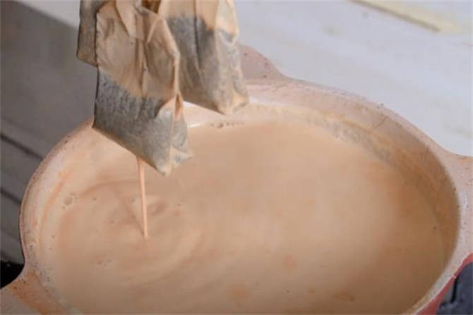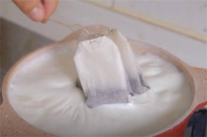 7.煮珍珠的時間咱們把牛奶煮一下,倒上1000g的牛奶,這1000g的牛奶把這個小奶鍋都盛滿瞭,大概有四盒左右的量,大約五六分鐘的時間咱們牛奶已經煮好瞭,在裡面放上四袋紅茶包,蓋上蓋子關火燜上5分鐘。