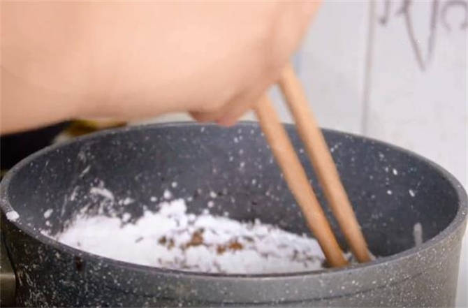 1.奶鍋裡面倒上80g的清水,再放上30g的紅糖或者黑糖,開小火把糖融化,現在這個糖水已經熬好瞭,已經沸騰瞭,咱們把100g的木薯淀粉倒進去,倒的時候快速攪拌。