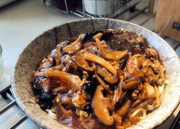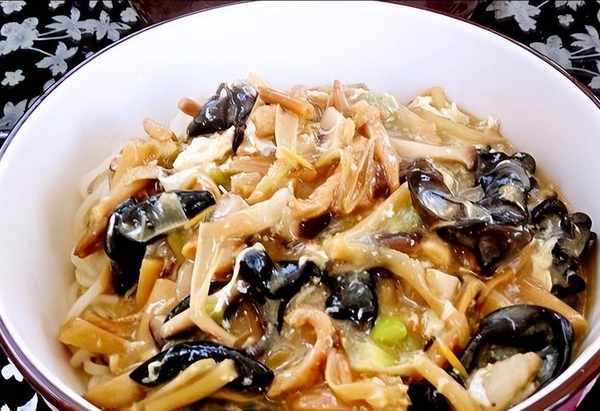 步驟三:生粉加水拌勻,雞蛋打入碗中打散備用,花椒植物油加熱,炸香之後過濾備用準備好之前的所有食材,鍋裡加入香菇片和木耳煮開,加入肉片煮15分鐘,加入食用鹽,加入老抽上色調味,勾芡至湯汁濃稠,雞蛋液用湯勺撇到鍋裡,定型之後順時針推動一下即可,鹵子就做好瞭。澆到切面上就可以吃瞭。