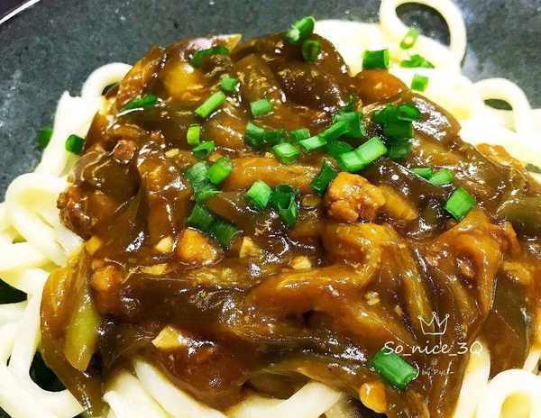 步驟四:倒入水淀粉勾個薄欠,收到湯汁濃稠可以關火瞭,最後將茄子鹵澆到之前煮好的切面上面拌勻即可。