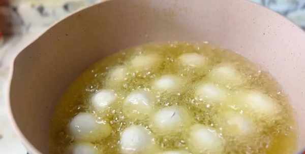 6、鍋中加油五成熱下入鵪鶉蛋炸至微微變色。炸鵪鶉蛋時火候不能太大,炸制的時間也不宜太長。