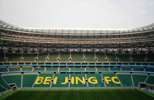 2023年4月1日,新工體,看臺座位上醒目的“BEIJING FC”。新京報記者 薛珺 攝