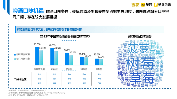啤酒口味多樣,傳統的清淡型和麥香型占據主導地位。白皮書數據顯示,中國啤酒消費者偏好口味主要有清爽清淡型、麥香型、果香型、稍甜型等。在即時零售渠道中,有63.5%的消費者選擇清爽清淡型啤酒;果香型作為後起之秀,也有將近五成消費者選擇。果味啤酒細分口味空間廣闊,存在較大機遇。