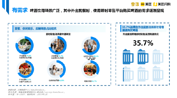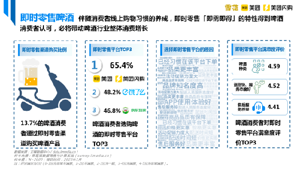 如今消費者外出就餐不再受到局限,將使啤酒在多元外出場景中持續滲透,啤酒飲用場景越發廣泛,使用即時零售平臺購買啤酒的需求逐漸顯現。即時零售履約效率高,更多消費者可享受到口感純正、新鮮的啤酒,大幅提升瞭啤酒消費者飲酒體驗。