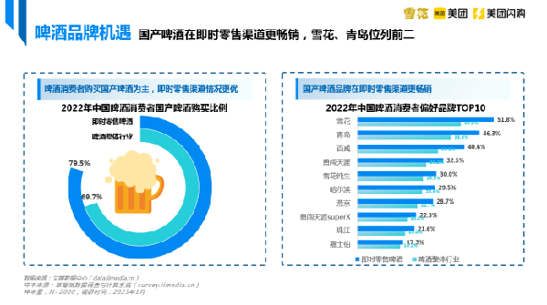 中國啤酒企積極佈局線上營銷,營收效果明顯。白皮書數據顯示,消費者購買啤酒主要以國產為主,即時零售渠道銷售情況較好,購買比例為79.5%;在消費者偏好品牌中,雪花、青島、百威位列前三,其中雪花有51.8%消費者從即時零售渠道購買。