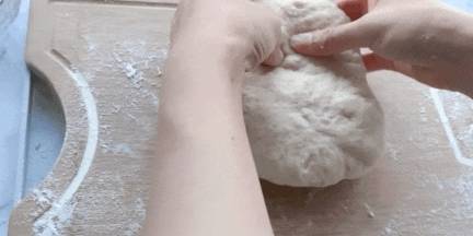 ③發酵好的面團用刮刀翻拌排出發酵時產生的氣體,然後面板上撒上幹粉,反復折疊面團,繼續排出面團內氣體。把面團壓癟,切成8塊,捏緊收口朝下,放在案板上,蓋上保鮮膜,醒發15分鐘。
