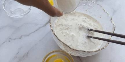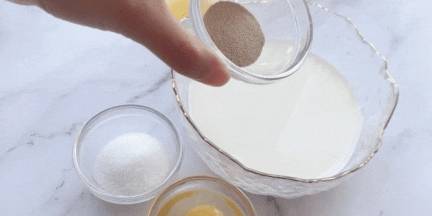 ①溫牛奶(30-40攝氏度左右)中加入酵母粉攪拌均勻,然後加入白砂糖、雞蛋、融化好的黃油攪拌均勻。