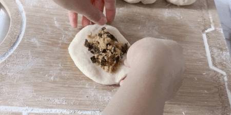 ④醒發好的面團按壓排氣,然後加入餡料,收口朝下放入墊上油紙的平底鍋內。