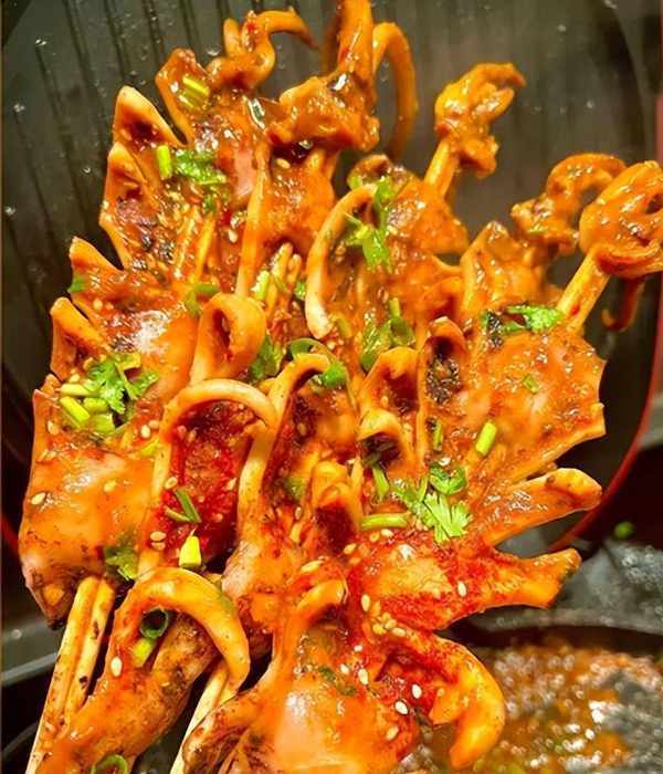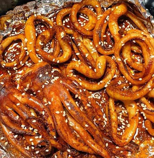 食材:魷魚須,洋蔥,豆瓣醬,辣椒段,蒜末,生抽,老抽,蠔油,芝麻,孜然粉。