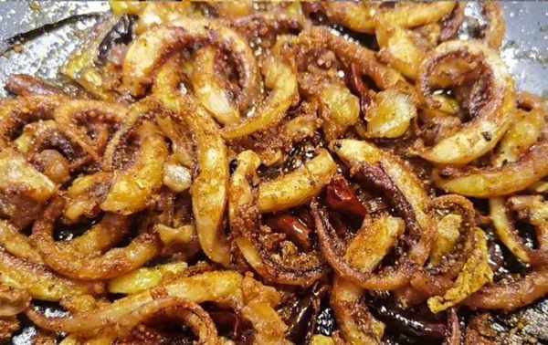 食材:魷魚,洋蔥,孜然粒,辣椒粉,白芝麻。