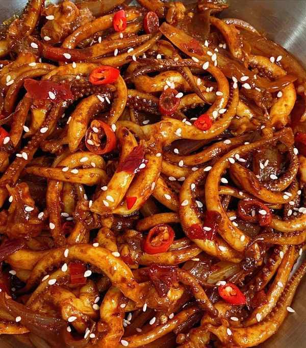 3、倒入魷魚須,放入生抽,老抽,蠔油,芝麻,孜然粉翻炒均勻即可出鍋,味道太絕瞭。