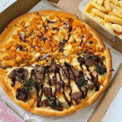 一份披薩配一盒炸雞,好吃而不膩,在外脆裡嫩、口感香脆的無骨雞腿肉上,淋上甜辣醬或是蜂蜜芥末醬,再撒點辣椒粉,大咬一口雞腿肉,熱氣從條條分明的肉絲間冒出,肉質軟嫩,每一口都是享受!