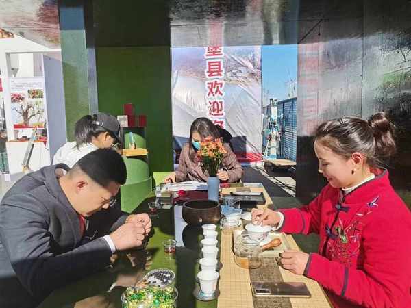 “客從遠方來,多以茶相待”。煤博會木秀於茶的展廳裡,茶桌前始終滿坐著客人。溫杯、洗茶、沖泡,聞香,再沖泡,將茶湯分給每一位客人。沸水泡茶,茶葉似入水活魚,上下翻騰,幾經沉浮,最後抵達壺底歸於平靜,此時茶香四溢,沁人心脾。能在塞上榆林,這帶著寒意的春風裡,品飲一杯韻味十足的古樹茶,是一件非常開心的事。身著“中國紅”棉麻茶服的茶藝師馬佩老師,始終保持著茶藝師具有的優雅身姿,捧杯沏茶,動作嫻熟且優美,溫柔且自然,讓人仿佛置身於一片清新怡人的天地。