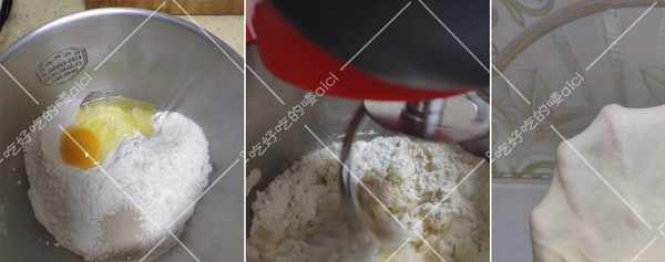 制作過程:1.高筋面粉放入廚師機中,打入一個雞蛋,放入白糖、耐高糖酵母和一丟丟的鹽。