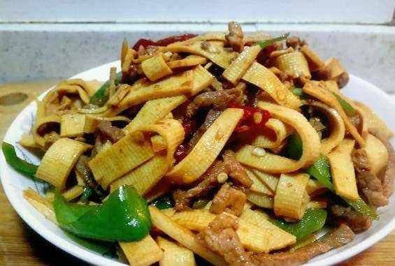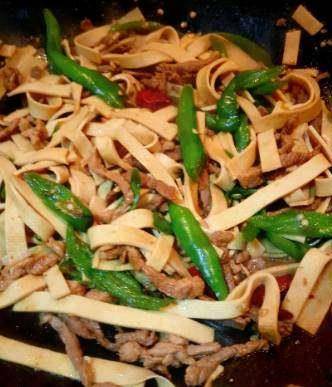 準備食材:來一坨豬肉、兩張千張就行瞭、杭椒4個左右、幹辣椒和蒜準備一點。千張對半切一下,然後切條,冷水入鍋焯一下水。煮肉提前切肉絲,下油鍋炒至變色後加一點點料酒,然後倒入蒜和幹辣椒炒炒炒,香味出來就可以下一步。
