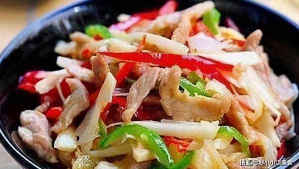 酸筍150克豬肉120克、燈籠椒1個、紅辣椒1個、色拉油1勺、雞湯1/8勺、生薑1/4勺、大蒜10克、熱酒10克,1tablelightsauce,1spooncorn,1tspofwater,2tbsp