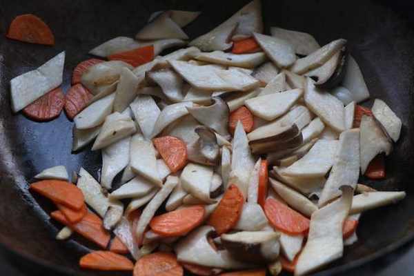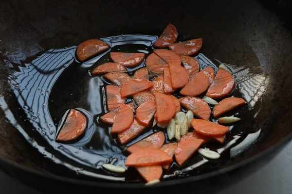 將鍋倒入適量的油,然後加入準備好的薑末。熱油將薑末爆香,然後我們就可以加入胡蘿卜片。