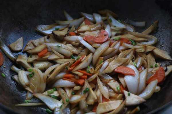 在制作雞腿菇炒洋蔥之前,我們需要先準備好食材。首先,我們需要備齊雞腿菇、洋蔥、胡蘿卜、蔥花、鹽、白胡椒和薑末等食材以及油和糖。