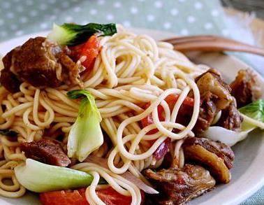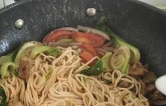 炒鍋內直接倒入牛肉和燉牛肉的湯半小碗,不用放油,中小火燒一會至開鍋汁下去一少半,入洋蔥、西紅柿、小油菜大火翻炒至小油菜剛要發蔫,倒入控過水的面條、生抽,拌勻,加鹽調個味,翻炒幾下就可以出鍋瞭!