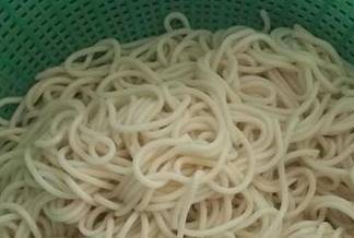 食材:燉好的牛肉塊,現買的圓面條,青菜,西紅柿和洋蔥!西紅柿切厚片,洋蔥切粗條,面條放入開水鍋裡煮至8分熟關火,過一下涼水、控水備用!