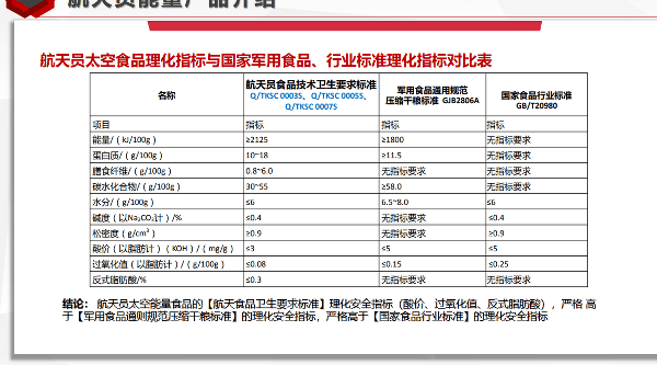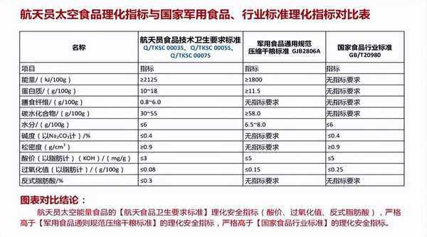 如今的航天早餐衛生要求標準理化安全指標(酸價、過氧化值、反式脂肪酸),嚴格高於軍用食品通則規范壓縮幹糧標準的理化安全指標,也嚴格高於國傢食品行業標準的理化安全指標。