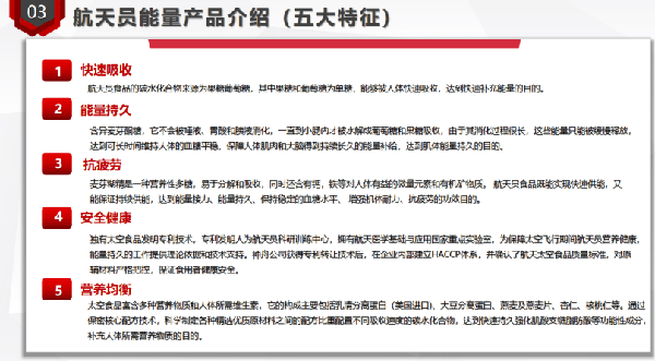 航天員太空能量餐以其快速吸收,能量持久,抗疲勞,安全健康,營養均衡的五大優勢足以補充人體營養元素.