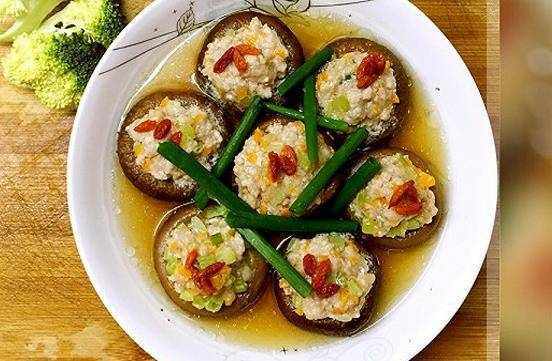鮮香菇6個,肉末100克,玉米粒15克,豌豆15克,紅辣椒10克,枸杞6粒,