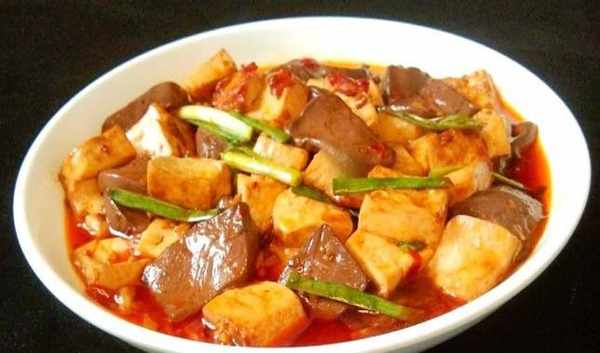 2、生薑切成厚片,洋蔥用斜刀剁細,蒜用刀剁細,大蒜剁細。所有的原料都準備好瞭。3、炒鍋燒熱,倒入一勺豬油燒熱。將切碎的薑、大蒜和洋蔥加入鍋中,讓它開始散發香味。然後加入郫縣豆瓣醬熱紅油,加一勺水用勺子拌勻,加入瀝幹的豆腐和鴨血,用手搖晃鍋子的同時用鍋鏟輕輕壓下鴨血和豆腐,以免粘鍋鍋。用鍋鏟盡量少攪動鍋,以免把豆腐弄破。4.加入適量料酒、生抽、蠔油和糖提鮮,然後用手搖動鍋,同時用勺子輕輕壓入豆腐,將鴨血拌勻,放入將香料均勻放入鍋中,加少許鹽和雞精調味後煮2分鐘。