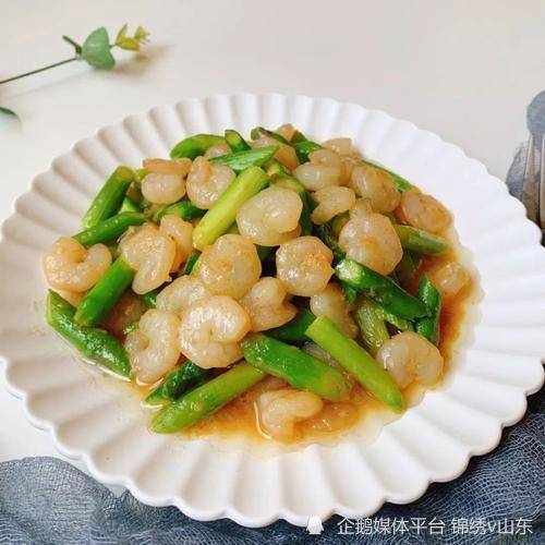 3、再次起鍋燒油,油熱後放入蒜末爆香,再放入蘆筍和適量食鹽,快速翻炒半分鐘左右,接著放入蝦仁翻炒幾下。最後放入雞精,翻炒均勻即可出鍋裝盤開吃。