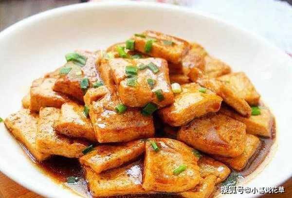 3.在鍋中加入更多的油,當它達到70%熱時,把它放在中火上。倒入面粉豆腐塊,一邊用大勺子慢慢攪拌一邊煮,以防止豆腐粘在一起。將豆腐塊炸至金黃色,撈出瀝幹油,裝盤。