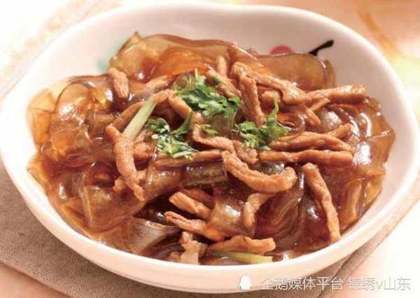 3.再將炒鍋置旺火上,倒入油燒熱,隨即將肉絲入鍋煸炒,加醬油,待肉色變色盛在粉絲上。澆上醋、香油、芥末、鹽水、味精兌成的汁,最好淋上麻醬即成。