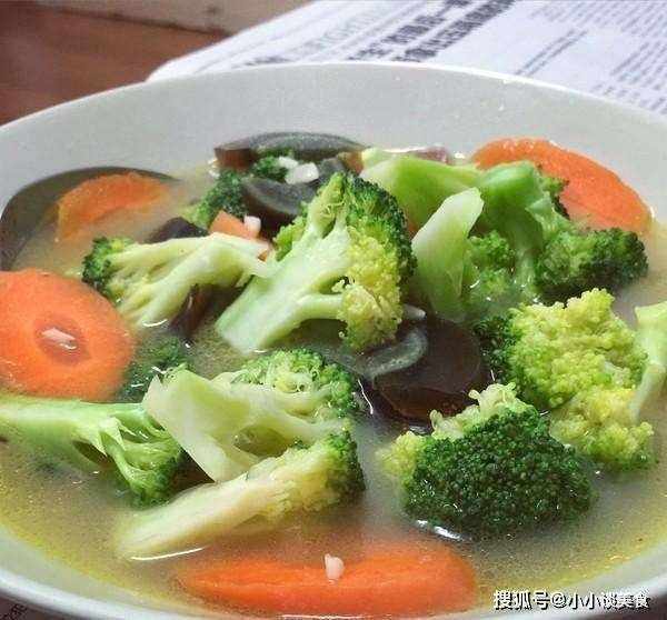 材料:西蘭花、皮蛋2個、胡蘿卜1根、薑、蒜、油3湯匙、水3碗、糖少許、鹽少許、料酒1湯匙、香油少許;