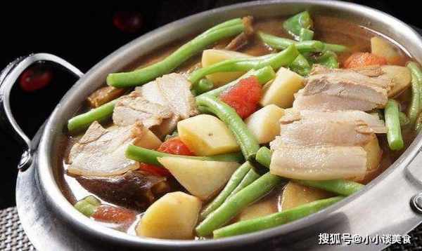 2.鍋裡燒油,加入八角和黃醬爆香,加入五花肉翻炒至熟,依次加入洋蔥、茄子、扁豆,燉好後撈出蔬菜,將南瓜炒勻,土豆泥連湯,上鍋前加入味精,攪拌均勻後倒入盤中。