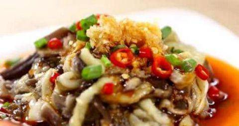 6、蒸好的茄子稍涼後,撕成長條裝盤