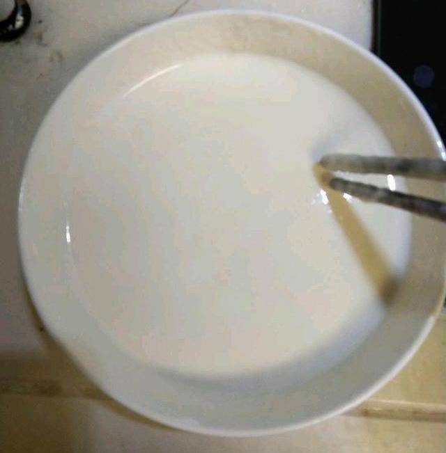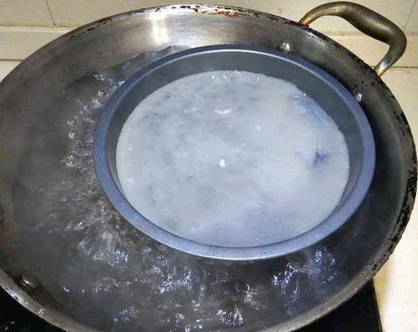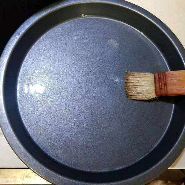盤子(也可以用不繡鋼碗)裡刷上一層薄薄的油,倒入面糊,攤勻。
