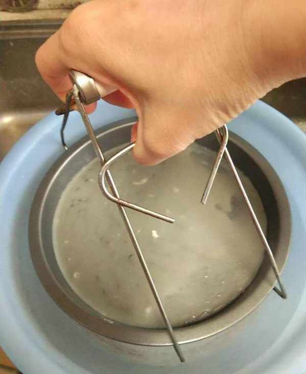 準備一盆涼水,把剛出鍋的蒸好的面皮,連碗夾出來放涼水中冷卻一下