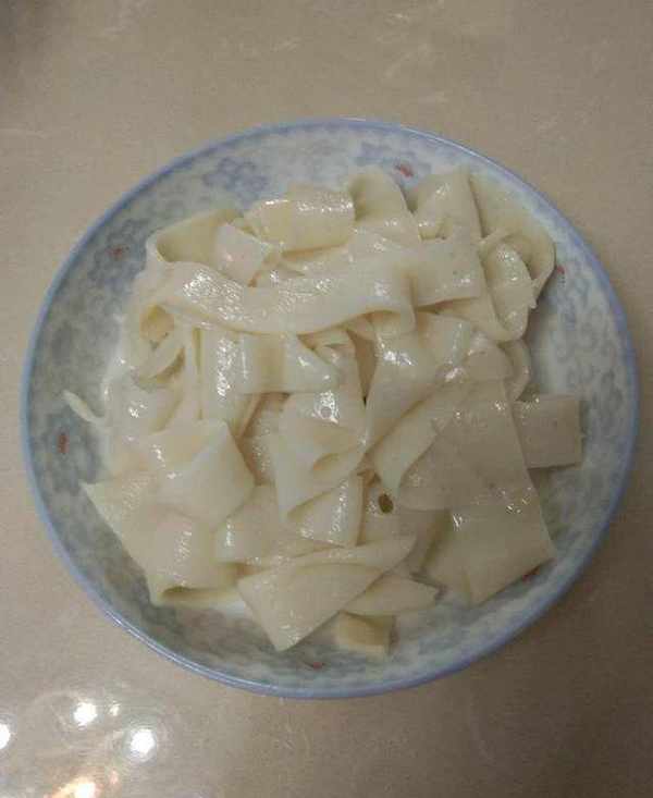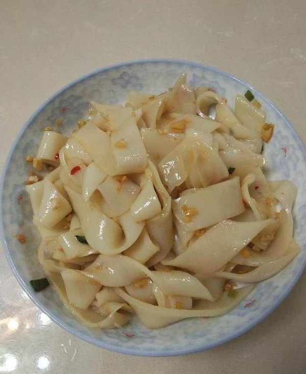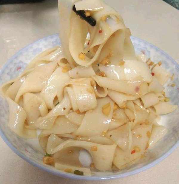 把開始準備好的調料(也再加入可以放黃瓜絲和花生米),攪拌進涼皮裡。
