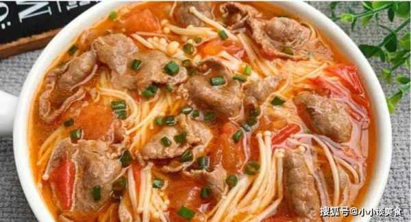 材料:肥牛片200克,西紅柿2個,金針菇1個,蒜3瓣,生抽1勺,蠔油1勺,番茄醬2勺,鹽,胡椒粉
