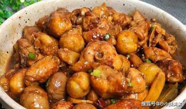 3、鍋裡放幾粒冰糖,融化煮至焦糖色,倒入雞塊翻炒上色,倒入蒜頭、桂皮、八角炒香,倒入栗子,攪拌均勻-炒,在雞塊上倒半碗水。