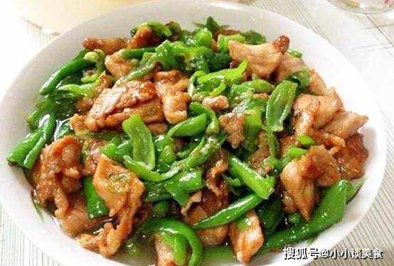 5、油熱後加入蔥花爆香。加入切碎的青椒,煮至青椒變色