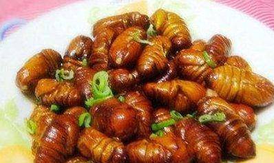 4、鍋內油燒熱,放入切好的薑蒜末,爆香,下蠶繭、蠶蛹炒香,加入胡椒粉、醬油、鹽,最後下蔥花出鍋。