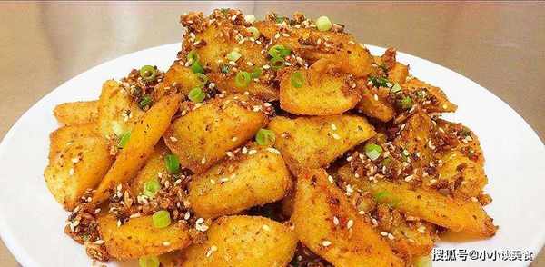 3.煎鍋倒入油,爆香薑末、孜然粒和幹紅辣椒。加入瀝幹的土豆塊,翻炒約兩分鐘