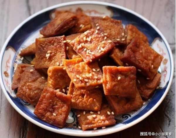 原料:幹白豆腐1公斤;3湯匙糖;1湯匙黑醬油;1茶匙鹽;一兩顆八角;少許芝麻油;一些煮熟的芝麻