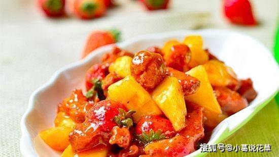 11、倒入炸好的雞肉片、草莓片和菠蘿片,翻動幾下讓汁液均勻流出。